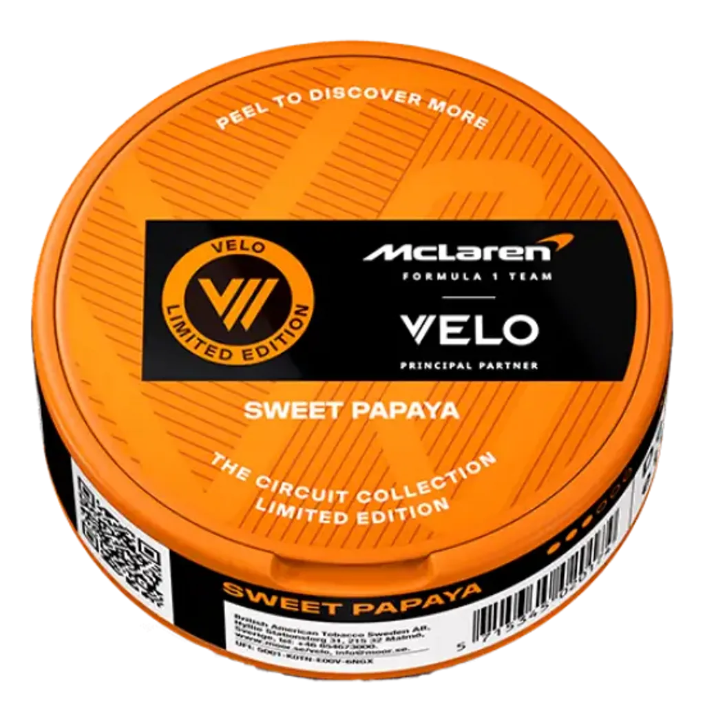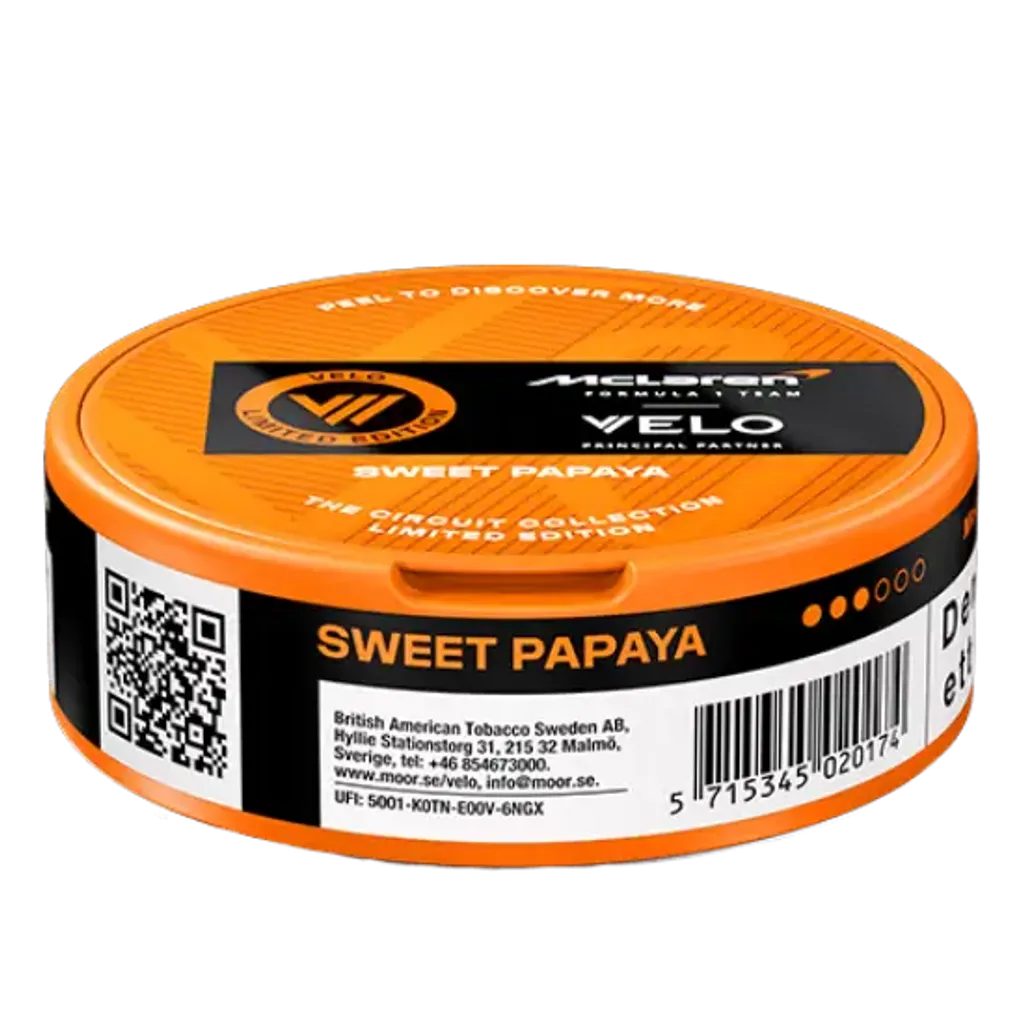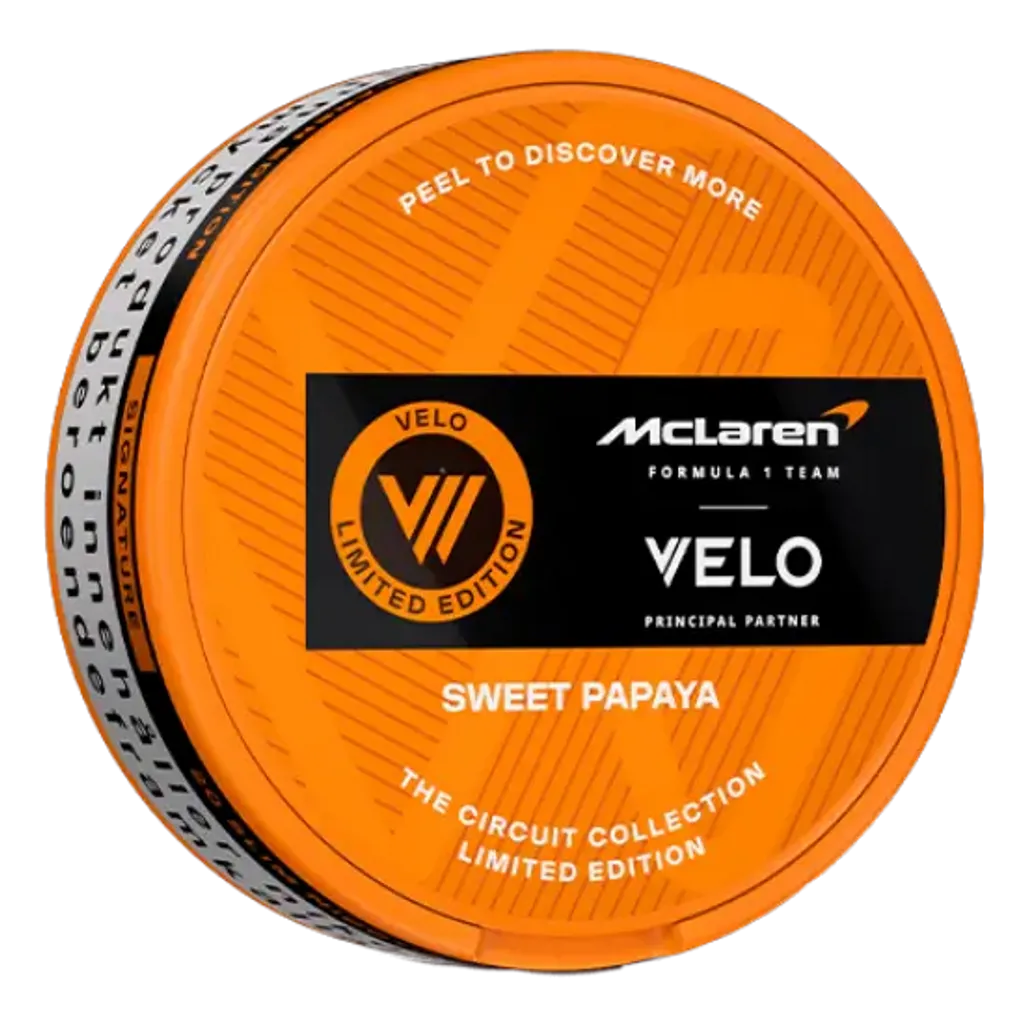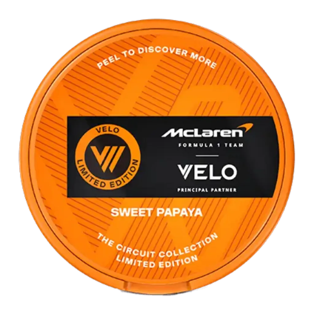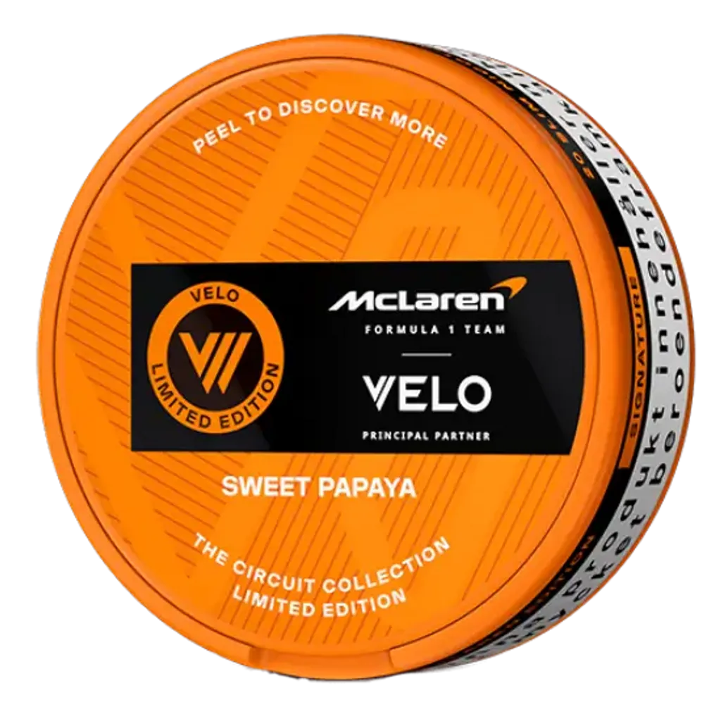VELO McLaren Sweet Papaya sind starke Nikotin Pouches mit 11,4 mg/g Nikotin. Der erfrischende Mix aus Papaya sorgt für ein intensives Geschmackserlebnis. Die Slim-Beutel sind tabakfrei, diskret und ideal für erfahrene Nutzer. Hergestellt von BAT in Schweden. Enthält 20 Pouches pro Dose. Jetzt Velo online kaufen.